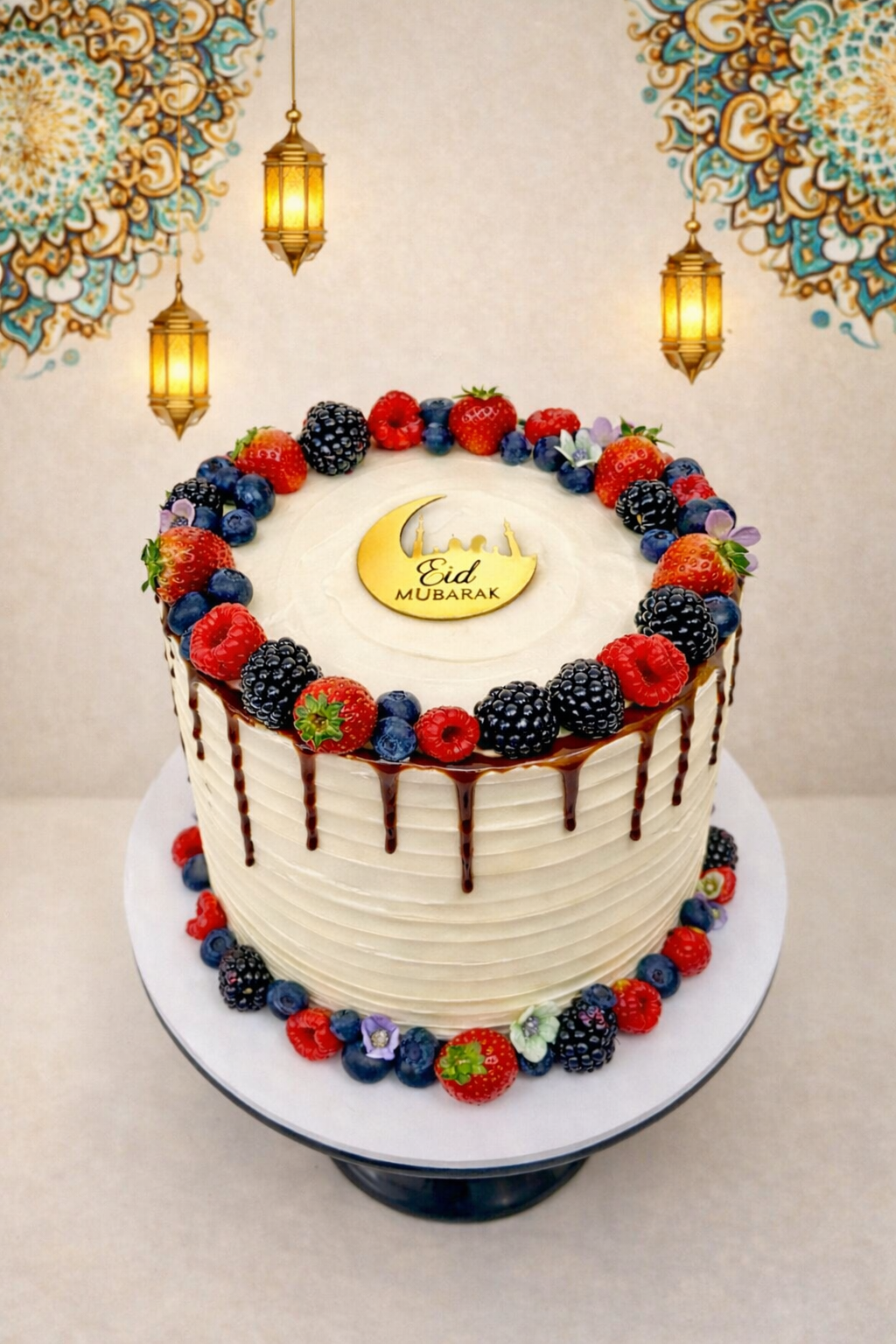 The Berry Eid cake is the perfect cake for any one who loves Fruit! You can personalise this cake with a cake topper. Available in a range of flavours, it doesn’t need to be a fruit filled cake! Delicious chocolate drip and topped in an array of fruits!