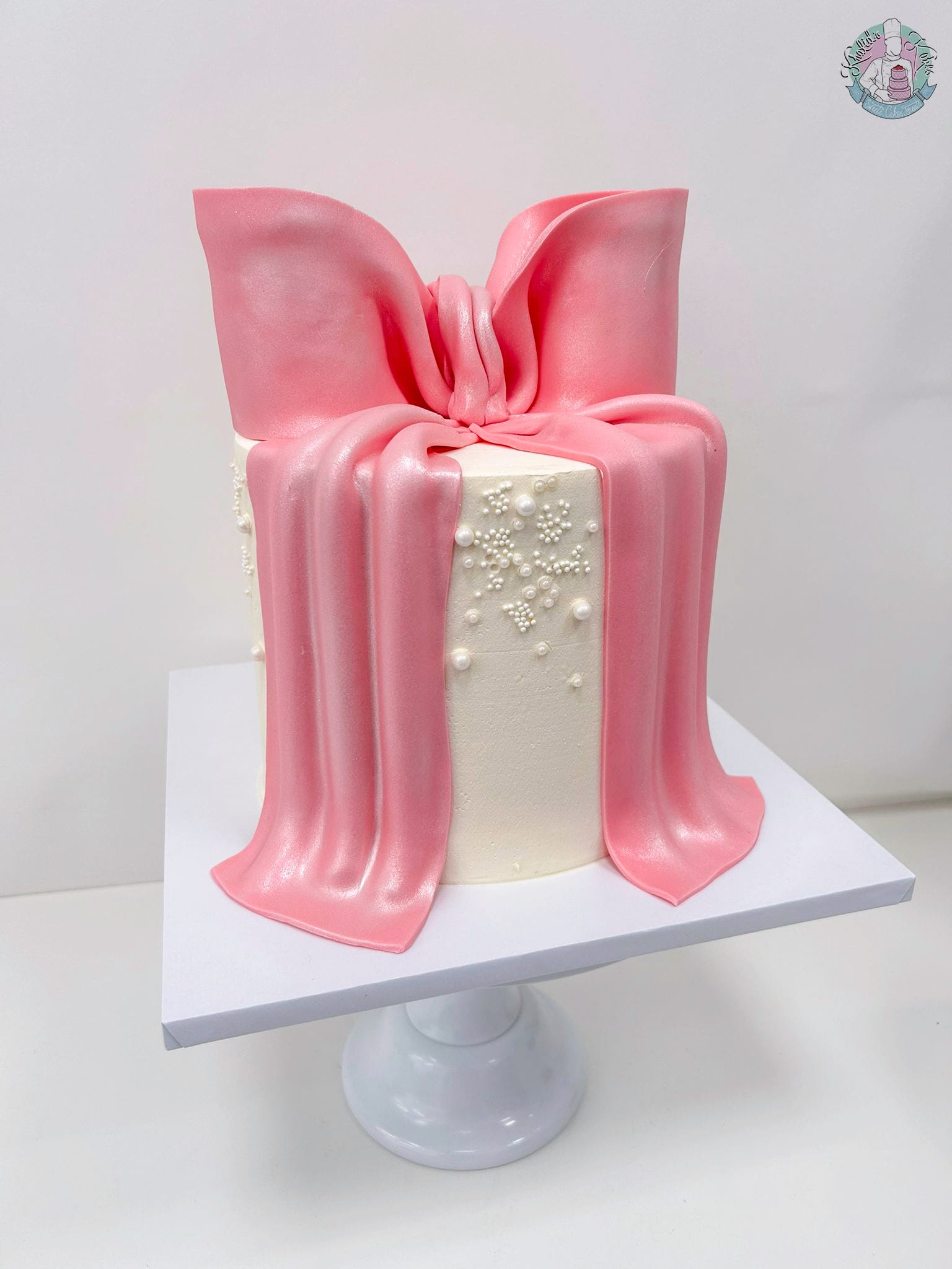 Its a elegant and simple cake with a large fondant bow in any colour make it perfect for romantic occasions or any event where you want to add a touch of whimsy and love.