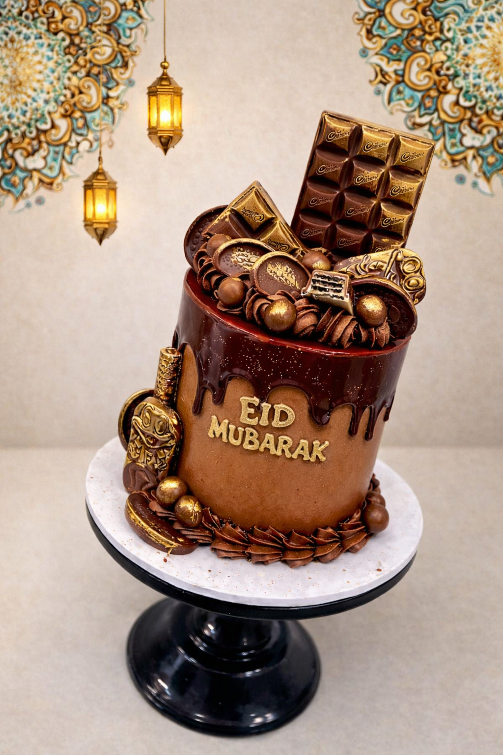 The Eid chocoholic cake is the perfect cake for any one who loves chocolate! Whether it’s a cake for him or a cake for her, everyone will enjoy this. You can personalise this cake with a cake topper. Available in a range of flavours, it doesn’t need to be a chocolate cake! Full of different chocolate bars, brushed in luxurious edible gold luster!