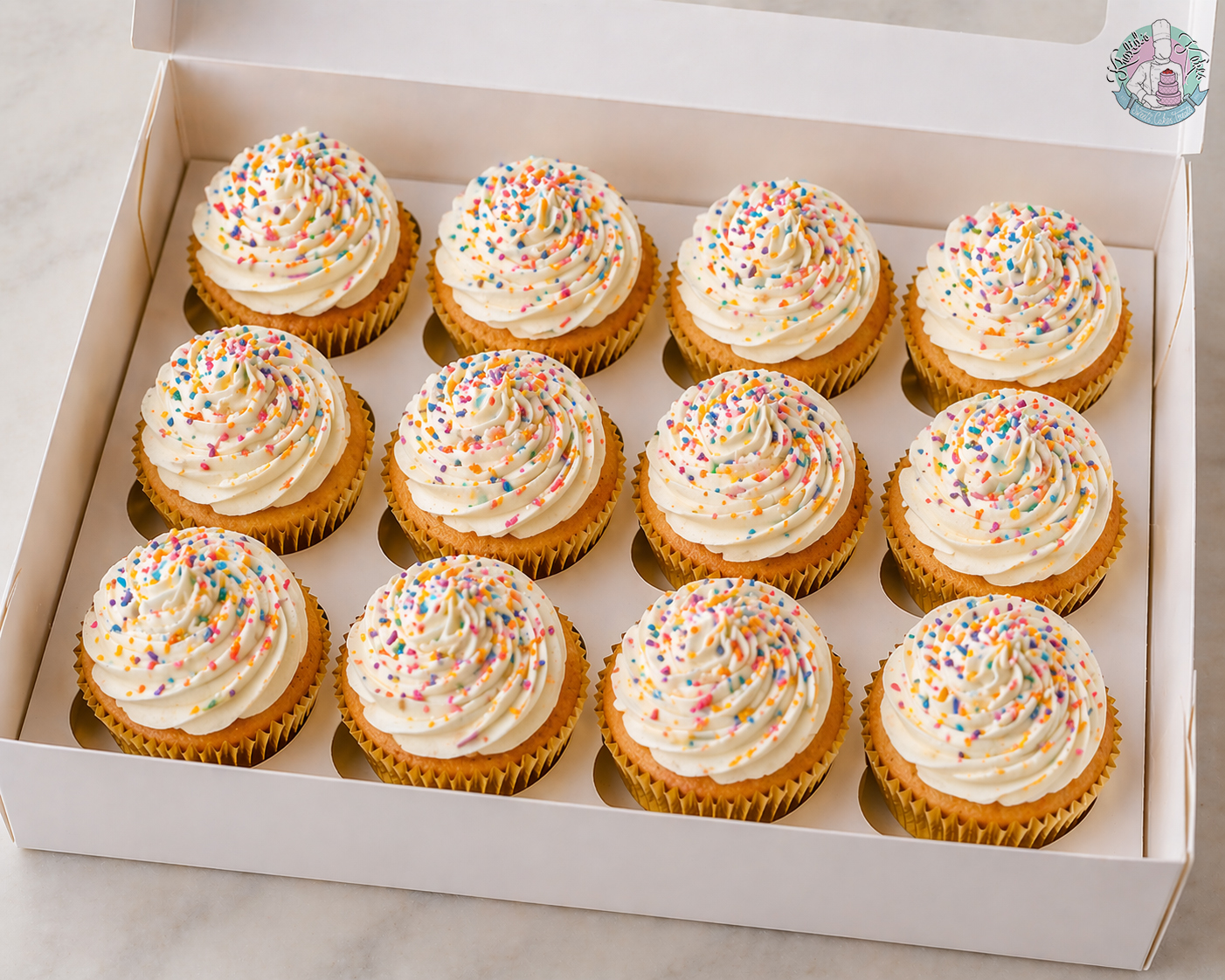 12 fluffy Funfetti Cupcakes – Funfetti sponge with a Strawberry jam filling and a Funfetti frosting. YUM!