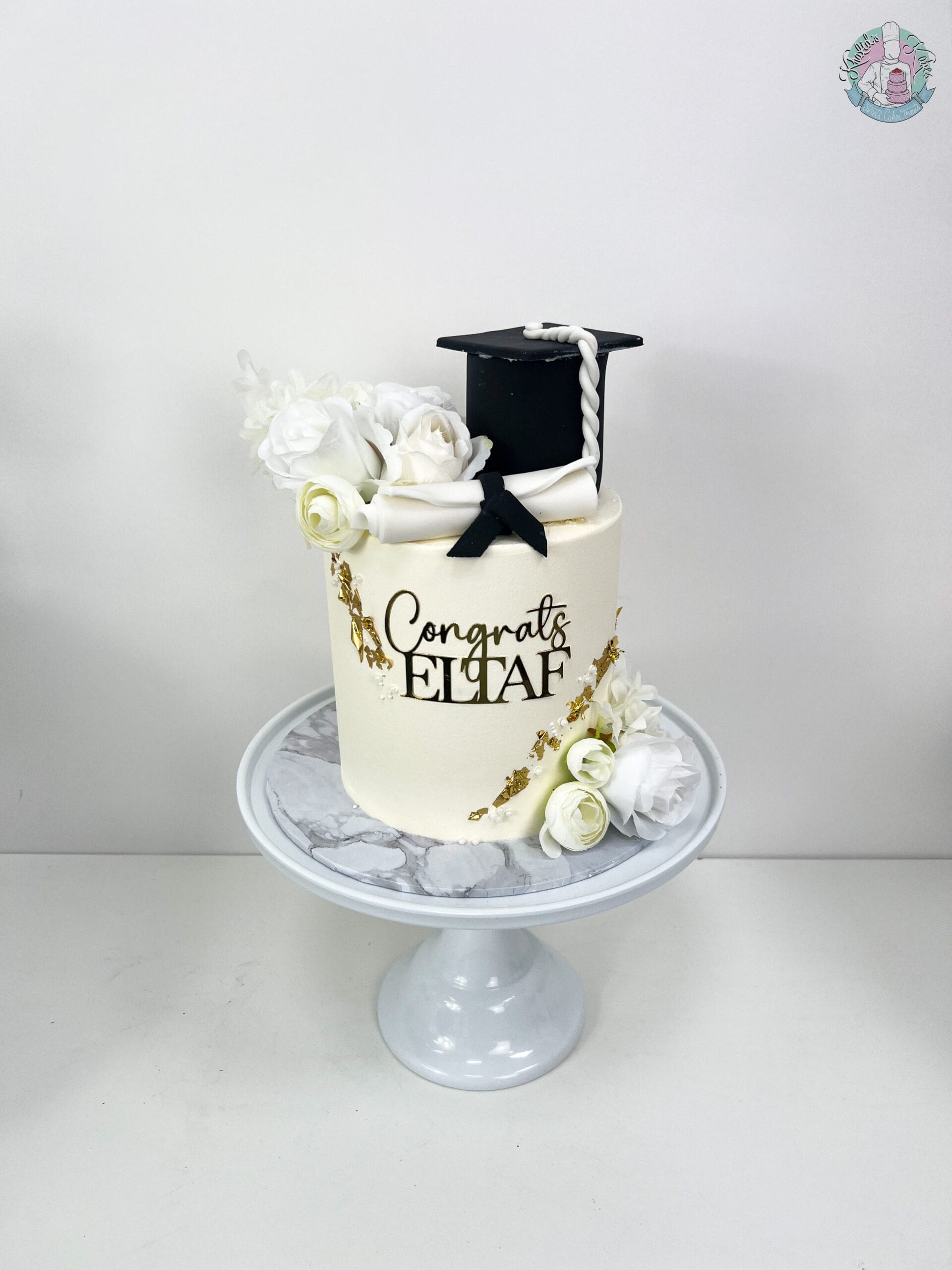 This cake features a delicate touch of metallic leaf filled with a custom selection of colours to choose from—White, Pinks, Peach, Purples, Red, Green, Blues – we can match your graduation themes