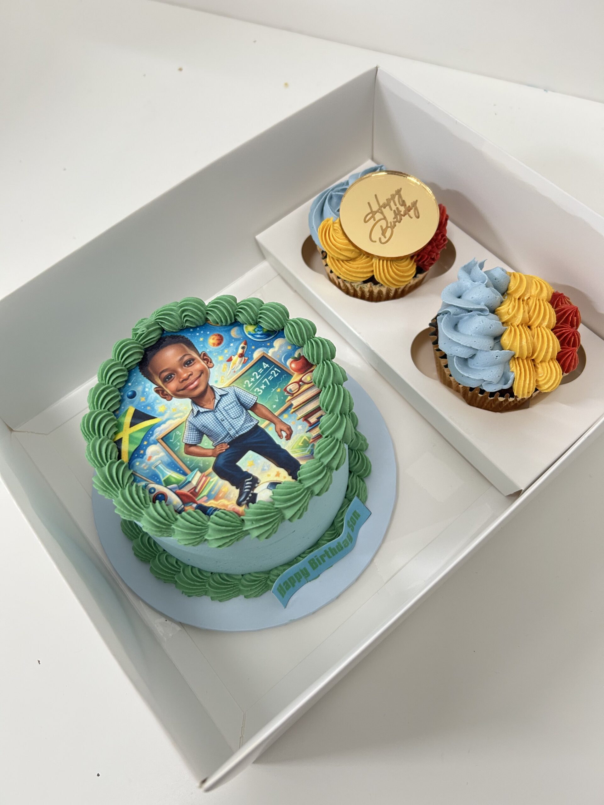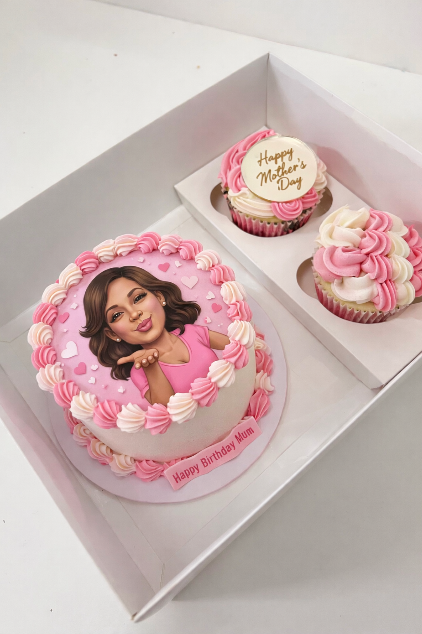 Indulge in fun with our Caricature Bento Box with 2 matching cupcakes. These are fun and crafted with either bright or pastel colours to match your celebration.  These mini cakes are perfect for gifting or elevating any occasion. This set blends vibrance and nostalgia with truly tasty flavours, making it a statement piece for dessert lovers.
