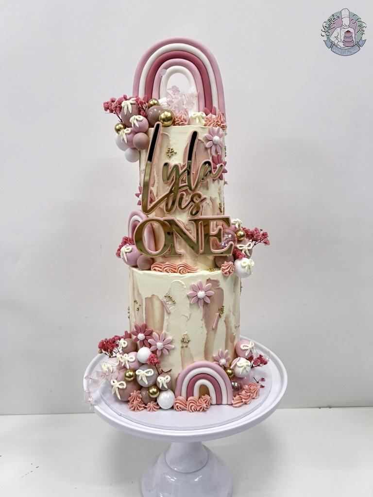 This Rainbow 2 Tier Cake is perfect for a first birthday cake! A Gorgeous cake in pretty pinks and bows. This one is definitely a show stopper, one to upload on all the socials!