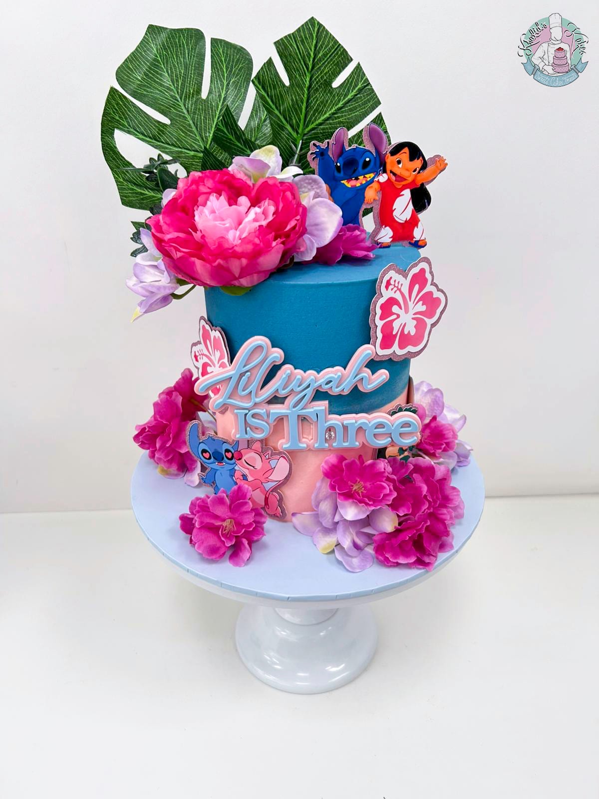 Our Stitch Cake is a delightfully decorated inspired by the famous films. It features bright colours like blues, pinks and tropical silk/card flowers. The cake’s surface is decorated with smooth and textured buttercream, card images of the characters and many more to fit that birthday vibe. The lilo and stitch cake is perfect for any stitch fan