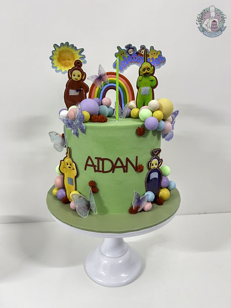 The Teletubbie Cake! Perfect for all the CBeebies toddlers! This cake would be the centre of all your Birthday celebrations with a beautiful buttercream finish, none edible rainbow and card cake toppers.