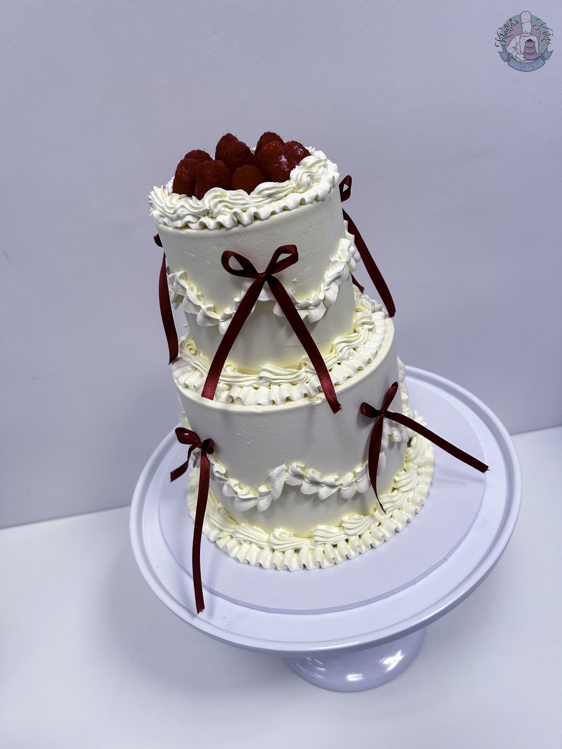 A Vintage Raspberry cake fit for any celebration. Delicately piped buttercream decorations with matching silk bows for added effect topped with fresh and juicy raspberries.