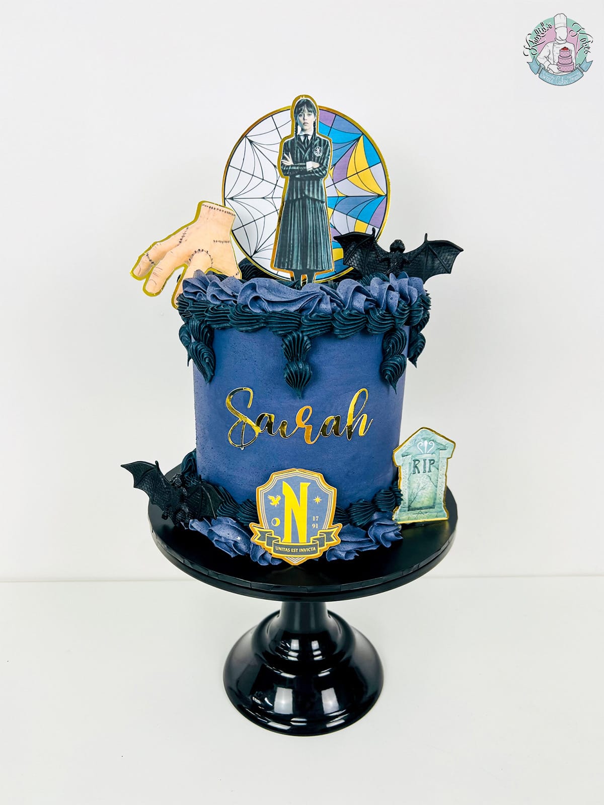 Indulge in the refined elegance of our Wednesday cake, delicate vintage piping in dark Adams family colours and card toppers!